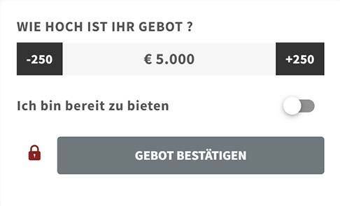 Wenn Sie ein Desktop verwenden, sehen Sie den Button "Gebot bestätigen", der aus Sicherheitsgründen zunächst gesperrt ist. Wählen Sie zuerst den Betrag, den Sie bieten möchten, aktivieren Sie den Schalter "Ich bin bereit zu bieten", und danach wird der Button "Gebot bestätigen" freigegeben.